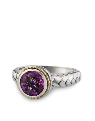 | Rings. Great for that special someone with a February birthday, this gleaming sterling silver ring features an amethyst center stone and 18K gold details. Round amethyst stone faceted to shine Braided 18K gold det... |