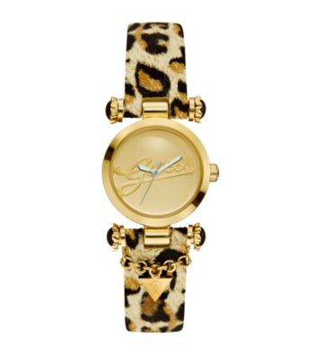 Watches. 30th Anniversary Edition! This GUESS watch features a goldtone case on a leopard printed genuine leather strap. Case size: 32mm Features iconic GUESS script logo Buckle closure 10 Year Limited Warranty Im...