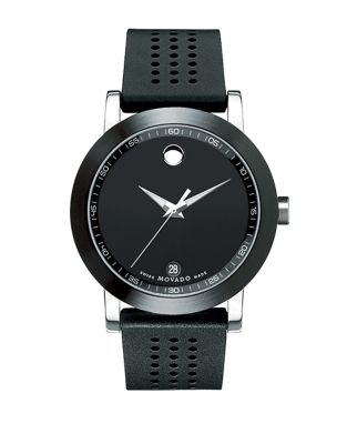 A handsome sport watch in solid stainless steel from Movado. Featuring a stainless steel case, a black museum dial, a date display window and a black perforated rubber strap. Swiss quartz movementMinute reflector ...