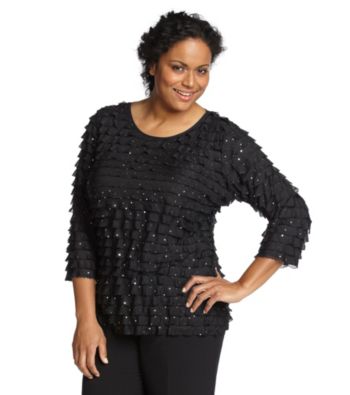 Shirts. This sparkling top from Notations provides movement and a shimmery silhouette for your next evening event. Featured in black Jewel neck Layered eyelash ruffles Sequined embellishment 3/4-length sleeves Pol...