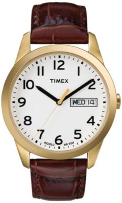 A brown leather strap with crocodile texture adds a dressy touch to the classic styling of this men's watch from Timex. The white dial is easy to read and is surrounded by a goldtone case. Case: Goldtone, brass Ca...