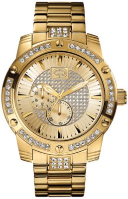 Marc Ecko The Possession multifunction watch for him in rich goldtone is iced with glittering crystals on the dial bezel and bracelet. Goldtone dial Japanese quartz movement 2 subdials Crystals on dial bezel and b...