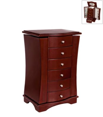 Jewelry Storage. An upright jewelry box in a streamlined hourglass shape featuring a gracefully curved front profile. Footed platform base for stability Lift lid with oval interior mirror Top compartment has one open section and one set of ring rolls Five drawers: top drawer has two sections, second drawer houses a full ring roll section, three bottom drawers offer open storage Dual necklace doors with interior catch panels house four hooks each Necklace door fronts feature routed detailing Brushed silver tone drawer pulls and hardware Hand lined in ivory sueded fabric 9" x 7" x 14" Imported
