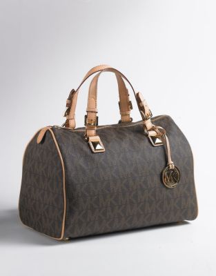 MICHAEL KORS HANDBAGS In signature Michael Kors style, the classic satchel bag gets a fabulous twist. The MK logo splashes across the chic structure with polished goldtone details. PVC zipper closure 1 zip pocket, 4 slip pockets inside 14(L) x 10(H) x 7.5(W)"; 5 inch handle drop.